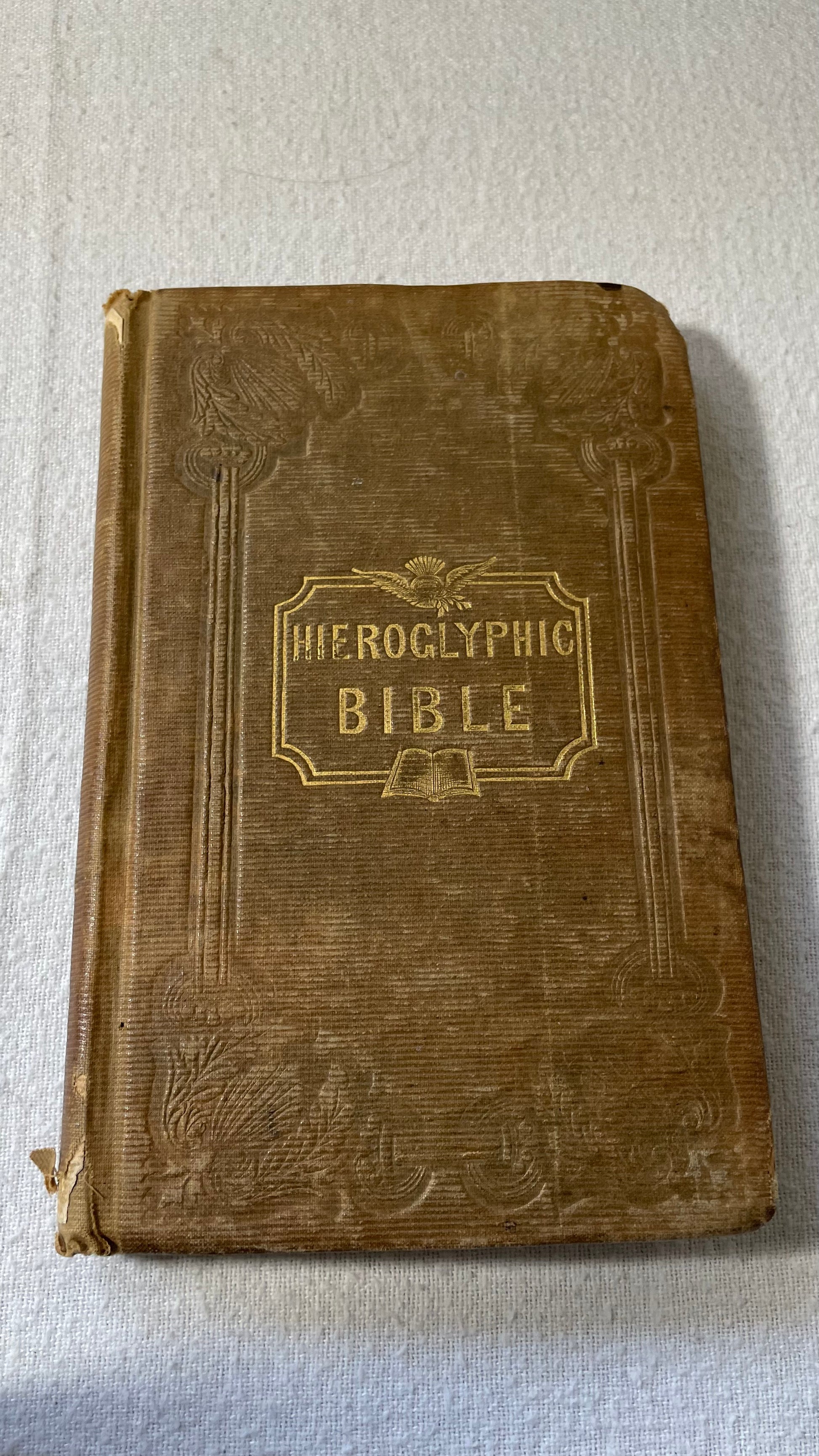 1841 5th edition print. Scarce. "Hieroglyhpic" on cover yet "Hieroglyphick" on Title. Profusely illustrated. Tells the tale of the Bible using symbols and pictures. Published in Rochester by William Alling. The Hieroglyphik Bible; or Select Passages in the Old and New Testaments represented with Emblematical Figures for the Amusement of Youth