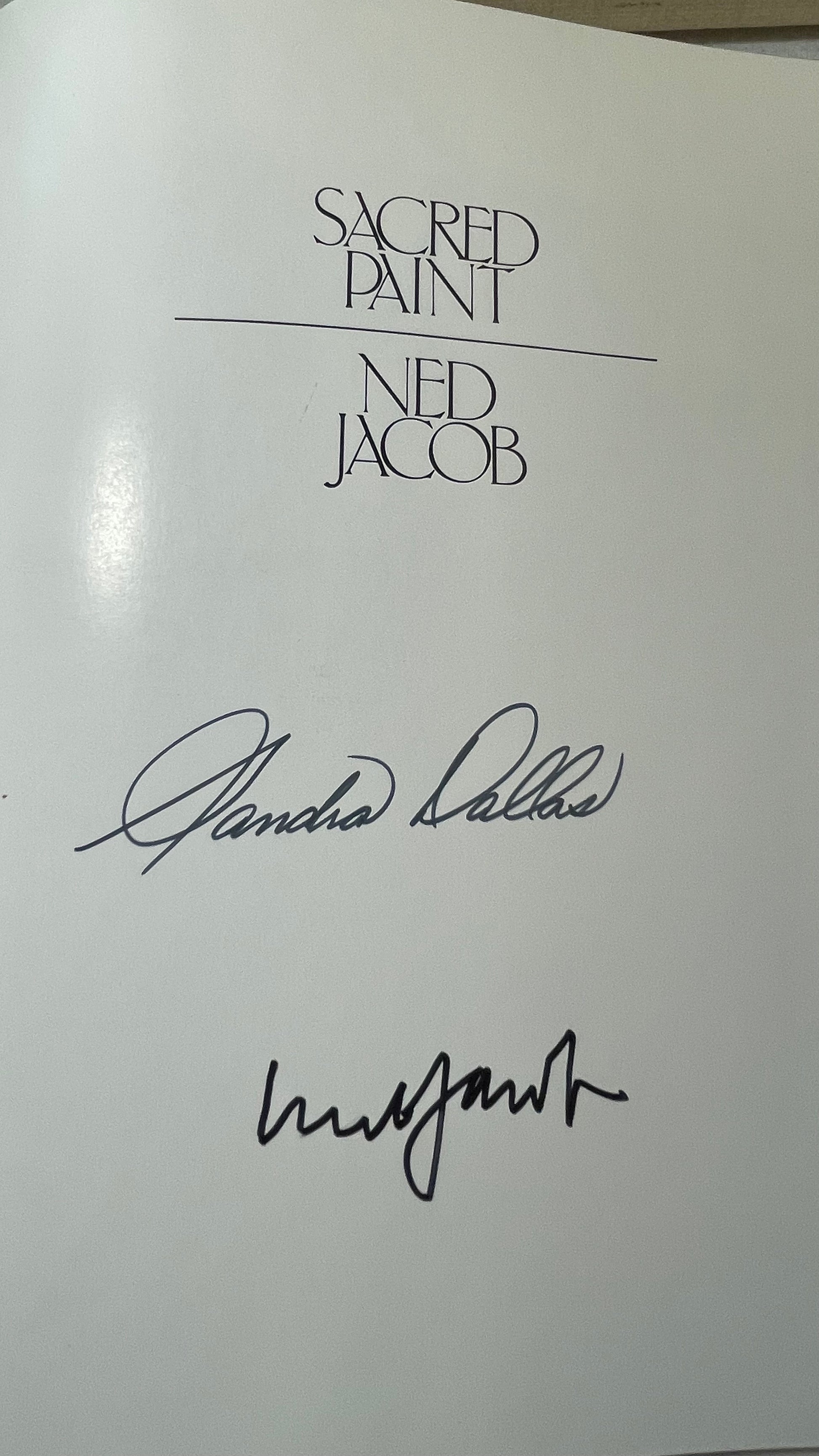 Signed on the original drawing by Ned Jacob and again on the title page by both Jacob and the author, Sandra Dallas. The text reflects Dallas's signature narrative style, offering a poetic accompaniment to Jacob’s spiritually rich visual imagery.